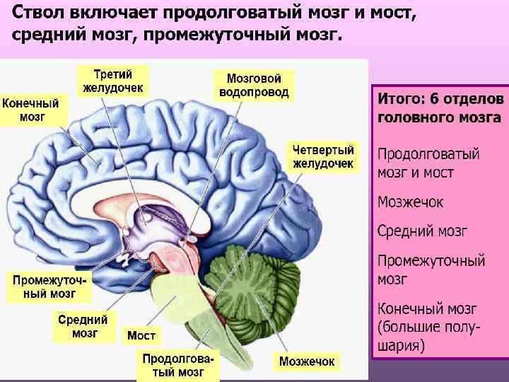 Основные отделы головного мозга: 1)Ствол 2)Мозжечок 3) Большие полушария