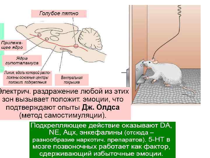 В 1954 г. Дж. Олдс и П. Милнер обнаружили центры «системы награды или подкрепления» в головном мозге. Дофамин является нейромедиатором, с помощью которого реализуется эмоционально-положительное состояние, его называют «молекулой удовольствия» или «антистрессовой молекулой» .