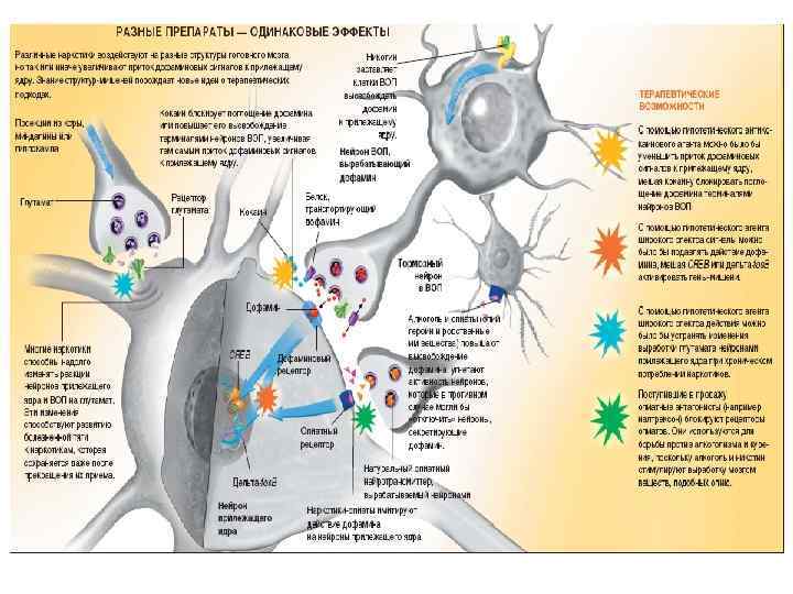 Механизмы действия наркотиков 1. CREB - основной фактор развития устойчивости к действию наркотиков, а при их отсутствии - дискомфорт 2. Высвобождение ДА→повышение уровня ц. АМФ и Са 2+ 3. Активация белка СREB→связывание с ДНК→активация генов 4. Специфические гены контролируют синтез белков, участвующие в наркотической толерантности и зависимости. 5. Белок динорфин угнетает выделение ДА и подавляет активность системы вознаграждения, усиливая потребность в наркотике. 6. Дельта-fos. B – основной фактор развития непреодолимой тяги к наркотику. 7. Высвобождение ДА→выработка белка дельта-fos. B. 8. Дельта-fos. B подавдяет синтез динорфина и активирует специфические гены. 9. Синтез белков, участвующих в сенситизации реакций на потребление наркотиков и воспоминания о доставленных ими наслаждениях. 10. Белок CDK 5 вызывает изменения в нейронах прилежащего ядра, которые надолго повышают их чувствительность к действию наркотиков.