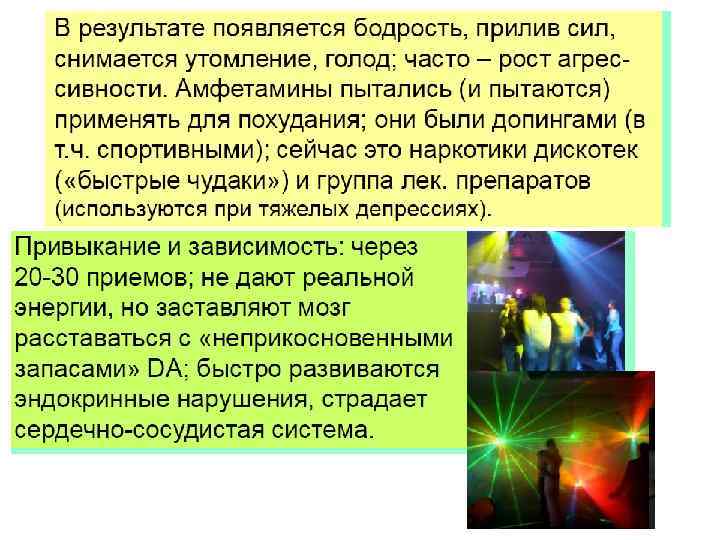 Кокаин: дает резкий, но кратковременный (20 -40 мин) всплеск положительных эмоций, ускорение мышления, мощный прилив энергии; рост чувства собственной значимости, "грандиозности". Быстрое формирование психологической и физиологической зависимости, изменение структуры личности в сторону агрессивности, эгоцентричности. . .
