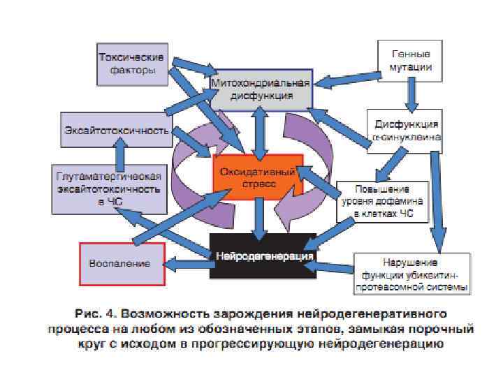 Расстройства внутриклеточного метаболизма, способствующие возникновению нейродегенерации (Крыжановский и др. , 2000): 1. нарушение ЭТЦ (I ФК ЭТЦ) и повреждение митохондрий (МРТР - N-метил-4 -фенил-1, 2, 3, 6 тетрагидро-пиридин); 2. энергетический дефицит нейрона; 3. усиление свободнорадикального окисления с образованием токсичных продуктов СРО; 4. перегрузка Fe 2+ нейронов черной субстанции (ферроптоз); 5. Са-перегрузка нейронов; 6. нарушение метаболизма ксенобиотиков.