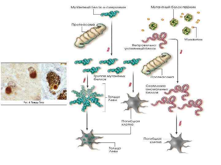 1. PARK 1 (α-синуклеин). Белок альфа-синуклеин играет важную роль в синаптическом везикулярном транспорте и хранении нейротрансмиттеров. Мутации в гене αсинуклеина → изменение структуры белка → его накопление в нейроне → агрегация белка с образованием телец Леви. В настоящее время α-синуклеин - ключевой молекулярный маркер БП. 2. PARK 2 (паркин). Мутации в гене паркина являются частой причиной раннего паркинсонизма. (до 50 % семейных форм и около 15 % спорадических случаев) Паркин представляет собой убиквитин-протеинлигазу типа Е 3, функция которой заключается в доставке аномальных белков в протеасомный комплекс для последующего расщепления.
