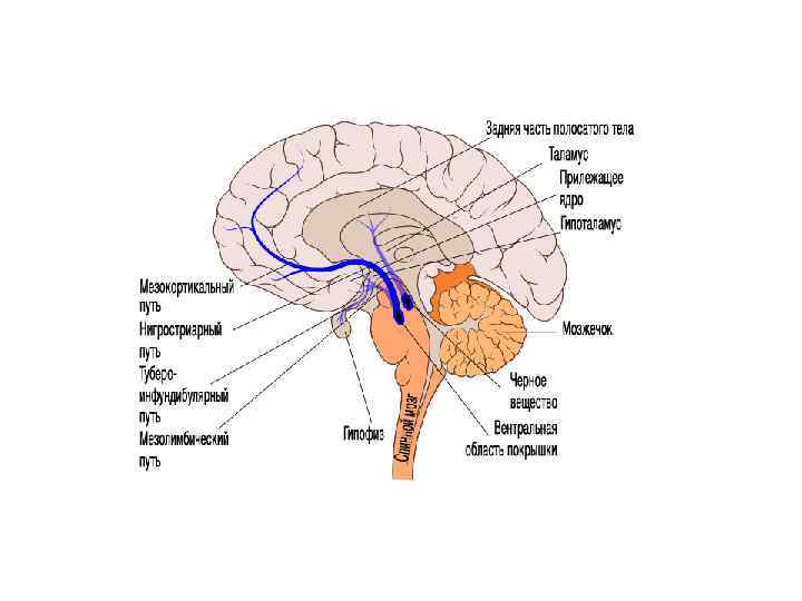 Структуры системы награды или подкрепления 1. Вентральная область покрышки (ventral tegmental area, VTA) — ключевой компонент «системы вознаграждения» (также известной как «система внутреннего подкрепления» ) в мозге млекопитающих. Примерно 55– 65% нейронов VTA — это дофаминовые нейроны, передающие сигналы другим нейронам при помощи нейромедиатора дофамина. Дофамин играет в мозге роль «вещества удовольствия» . 2. Дофаминовые сигналы из VTA поступают в префронтальную кору, где происходят сознательные психические процессы, в гиппокамп, управляющий запоминанием (это может быть связано с обучением на положительном опыте). 3. Прилежащее ядро (nucleus accumbens) называют «главным центром удовольствия» и которое отвечает за мотивацию, привязанности и зависимости. 4. Голубое пятно 5. Миндалина (amigdala) - «эмоциональный» отдел мозга.