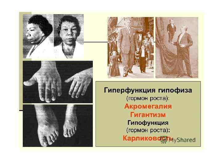 Избыток сигнала - гигантизм Гигантизм — заболевание, при котором наблюдается повышенная выработка соматотропина (гормона роста) гипофизом, что в свою очередь приводит к чрезмерному пропорциональному росту конечностей и туловища. У мужчин с данным заболеванием рост превышает 200 см, а у женщин — 190 см.