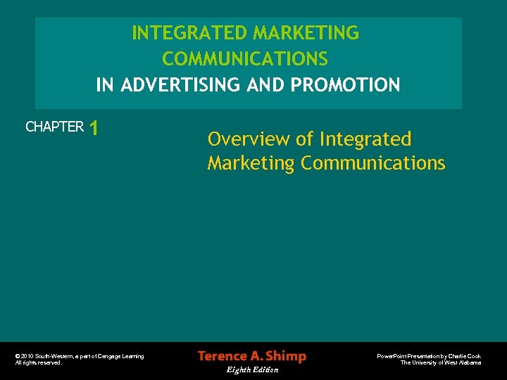 INTEGRATED MARKETING COMMUNICATIONS IN ADVERTISING AND PROMOTION CHAPTER 1 © 2010 South-Western, a part of Cengage Learning All rights reserved. Overview of Integrated Marketing Communications Eighth Edition Power. Point Presentation by Charlie Cook The University of West Alabama