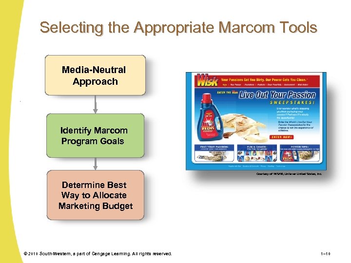 Selecting the Appropriate Marcom Tools Media-Neutral Approach Identify Marcom Program Goals Courtesy of WISK®, Unilever United States, Inc. Determine Best Way to Allocate Marketing Budget © 2010 South-Western, a part of Cengage Learning. All rights reserved. 1– 10
