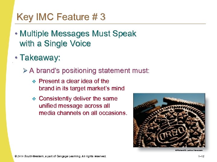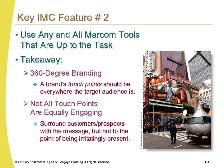 Key IMC Feature # 2 • Use Any and All Marcom Tools That Are Up to the Task • Takeaway: Ø 360 -Degree Branding v A brand’s touch points should be everywhere the target audience is. Ø Not All Touch Points Are Equally Engaging v Surround customers/prospects with the message, but not to the point of being irritatingly present. © 2010 South-Western, a part of Cengage Learning. All rights reserved. 1– 11
