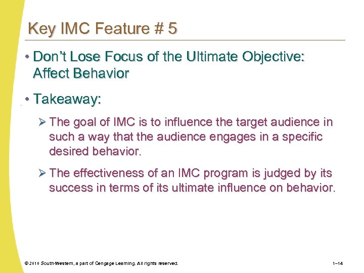 Key IMC Feature # 4 • Build Relationships Rather Than Engage in Flings • Takeaway: Ø Loyalty programs promote long- term relationships between customers and brands that lead to customer retention. Ø Experiential marketing programs can create brand experiences that make positive and lasting impressions on customers. © 2010 South-Western, a part of Cengage Learning. All rights reserved. 1– 13