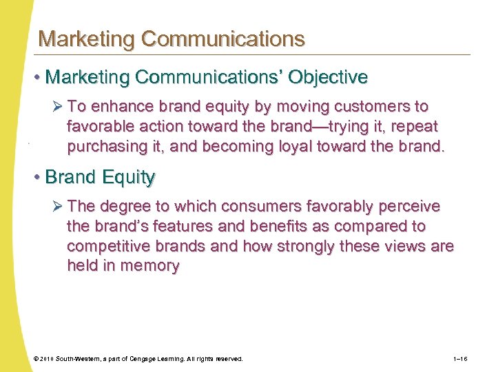 Marketing Communications • Marketing Communications’ Objective Ø To enhance brand equity by moving customers to favorable action toward the brand—trying it, repeat purchasing it, and becoming loyal toward the brand. • Brand Equity Ø The degree to which consumers favorably perceive the brand’s features and benefits as compared to competitive brands and how strongly these views are held in memory © 2010 South-Western, a part of Cengage Learning. All rights reserved. 1– 16