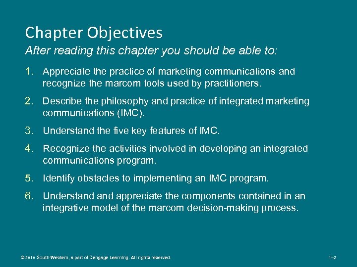 Chapter Objectives After reading this chapter you should be able to: 1. Appreciate the practice of marketing communications and recognize the marcom tools used by practitioners. 2. Describe the philosophy and practice of integrated marketing communications (IMC). 3. Understand the five key features of IMC. 4. Recognize the activities involved in developing an integrated communications program. 5. Identify obstacles to implementing an IMC program. 6. Understand appreciate the components contained in an integrative model of the marcom decision-making process. © 2010 South-Western, a part of Cengage Learning. All rights reserved. 1– 2