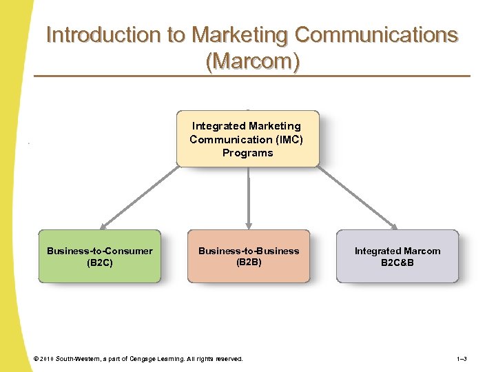 Introduction to Marketing Communications (Marcom) Integrated Marketing Communication (IMC) Programs Business-to-Consumer (B 2 C) Business-to-Business (B 2 B) © 2010 South-Western, a part of Cengage Learning. All rights reserved. Integrated Marcom B 2 C&B 1– 3