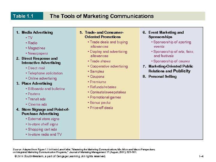 Table 1. 1 The Tools of Marketing Communications 1. Media Advertising • TV • Radio • Magazines • Newspapers 2. Direct Response and Interactive Advertising • Direct mail • Telephone solicitation • Online advertising 3. Place Advertising • Billboards and bulletins • Posters • Transit ads • Cinema ads 4. Store Signage and Point-of. Purchase Advertising • External store signs • In-store shelf signs • Shopping cart ads • In-store radio and TV 5. Trade- and Consumer. Oriented Promotions • Trade deals and buying allowances • Display and advertising allowances • Trade shows • Cooperative advertising • Samples • Coupons • Premiums • Refunds/rebates • Contests/sweepstakes • Promotional games • Bonus packs • Price-off deals 6. Event Marketing and Sponsorships • Sponsorship of sporting events • Sponsorship of arts, fairs, and festivals • Sponsorship of causes 7. Marketing-Oriented Public Relations and Publicity 8. Personal Selling Source: Adapted from Figure 1. 1 in Kevin Lane Keller, “Mastering the Marketing Communications Mix: Micro and Macro Perspectives on Integrated Marketing Communication Programs, ” Journal of Marketing Management 17 (August, 2001), 823– 851. © 2010 South-Western, a part of Cengage Learning. All rights reserved. 1– 4