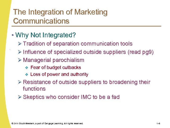 The Integration of Marketing Communications • Why Not Integrated? Ø Tradition of separation communication tools Ø Influence of specialized outside suppliers (read pg 9) Ø Managerial parochialism v v Fear of budget cutbacks Loss of power and authority Ø Resistance of outside suppliers to broadening their functions Ø Skeptics who consider IMC to be a fad © 2010 South-Western, a part of Cengage Learning. All rights reserved. 1– 5