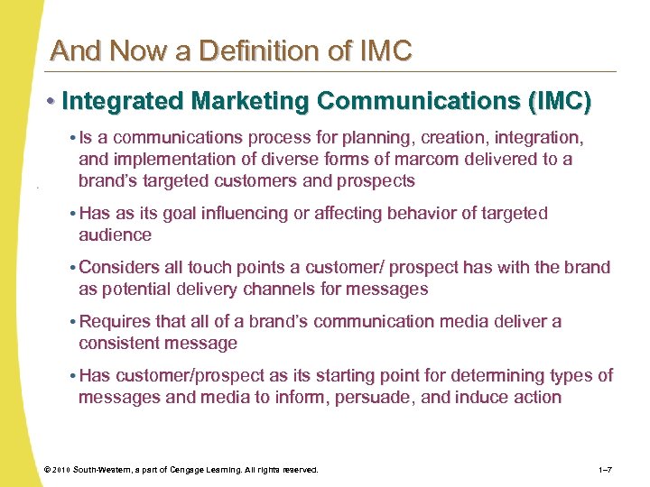 Table 1. 2 Five Key Features of IMC 1. Start with the customer or prospect. 2. Use any form of relevant contact or touch point. 3. Speak with a single voice. 4. Build relationships. 5. Affect behavior. © 2010 South-Western, a part of Cengage Learning. All rights reserved. 1– 8