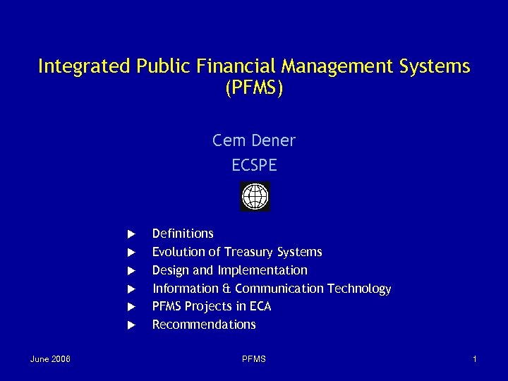 Integrated Public Financial Management Systems (PFMS) Cem Dener ECSPE u u u June 2006 Definitions Evolution of Treasury Systems Design and Implementation Information & Communication Technology PFMS Projects in ECA Recommendations PFMS 1