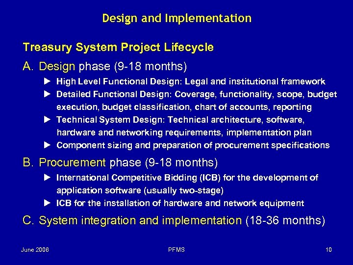 Evolution of Treasury Systems 4. Design and implementation of information systems u Secure countrywide network infrastructure u Development of web-based application software u Central servers and data storage/backup units u Standard field hardware u System and network management tools u Technical maintenance and support systems u System safety / security and business continuity solutions u Web publishing (web portal) June 2006 PFMS 9