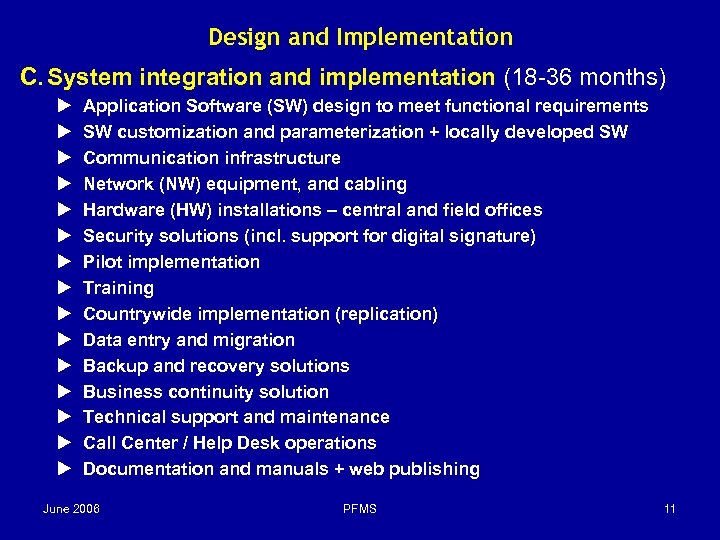 Design and Implementation Treasury System Project Lifecycle A. Design phase (9 -18 months) u High Level Functional Design: Legal and institutional framework u Detailed Functional Design: Coverage, functionality, scope, budget execution, budget classification, chart of accounts, reporting u Technical System Design: Technical architecture, software, hardware and networking requirements, implementation plan u Component sizing and preparation of procurement specifications B. Procurement phase (9 -18 months) u International Competitive Bidding (ICB) for the development of application software (usually two-stage) u ICB for the installation of hardware and network equipment C. System integration and implementation (18 -36 months) June 2006 PFMS 10