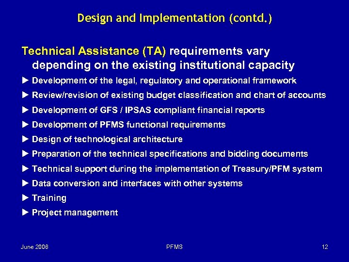 Design and Implementation C. System integration and implementation (18 -36 months) u u u u Application Software (SW) design to meet functional requirements SW customization and parameterization + locally developed SW Communication infrastructure Network (NW) equipment, and cabling Hardware (HW) installations – central and field offices Security solutions (incl. support for digital signature) Pilot implementation Training Countrywide implementation (replication) Data entry and migration Backup and recovery solutions Business continuity solution Technical support and maintenance Call Center / Help Desk operations Documentation and manuals + web publishing June 2006 PFMS 11