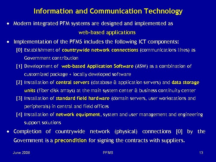Information and Communication Technology · Modern integrated PFM systems are designed and implemented as web-based applications · Implementation of the PFMS includes the following ICT components: [0] Establishment of countrywide network connections (communications lines) as Government contribution [1] Development of web-based Application Software (ASW) as a combination of customized package + locally developed software [2] Installation of central servers (database & application servers) and data storage units (fiber disk arrays) at the main system center & business continuity center [3] Installation of standard field hardware (domain servers, user workstations and peripherals) in central and field offices [4] Installation of network equipment, system and user management and engineering support solutions · Completion of countrywide network (physical) connections [0] by the Government is a precondition for signing the contracts with suppliers. June 2006 PFMS 13