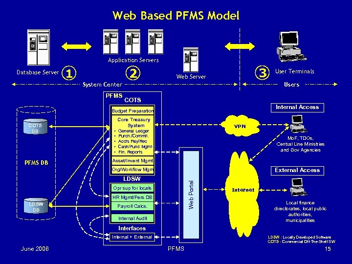 Technology Architecture 3 -Tier Web-Based B C C M 1 SC Database Server(s) [2] Central Servers 2 Application Servers [0] [1] Wide Area Network PFMS Application Software Internet Web Server PFMS DB Firewall Mo. F / Treasury District Offices [3] Field Hardware Special DU lines for towns Collection Point (city center) FR line Local Server 3 FR line Virtual Private Network Encryption Tunnelling District Offices PCs / Thin Clients MSC : Main System Center BCC : Business Continuity Center June 2006 [4] Network Equipment District Offices Spending Units PFMS 14