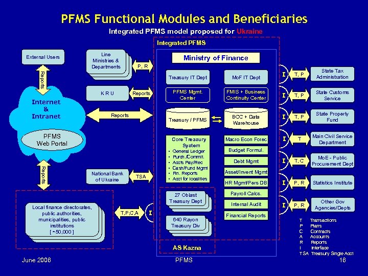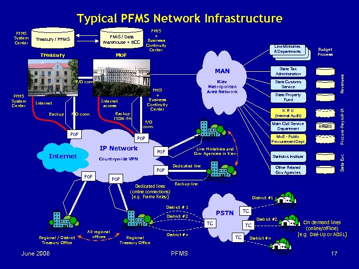 PFMS Functional Modules and Beneficiaries Integrated PFMS model proposed for Ukraine Integrated PFMS External Users Line Ministries & Departments Ministry of Finance P, R I T, P State Tax Administration PFMS Mgmt. Center FMIS + Business Continuity Center I T, P State Customs Service BCC + Data Warehouse I T, P State Property Fund Macro Econ Forec I T Main Civil Service Department I T, C Mo. E - Public Procurement Dept I P, R Statistics Institute I P, R Other Gov Agencies/Depts Reports KRU Internet & Intranet Mo. F IT Dept Treasury / PFMS Reports Treasury IT Dept Reports PFMS Web Portal Core Treasury System Reports National Bank of Ukraine • • • TSA 27 Oblast Treasury Dept Spending Units Local finance directorates, public authorities, municipalities, public institutions [ ~50, 000 ] General Ledger Purch. /Commit. Accts Pay/Rec Cash/Fund Mgmt Fin. Reports Acct for localities T, P, C, A I 640 Rayon Treasury Div AS Kazna June 2006 PFMS Budget Formul. Debt Mgmt Asset/Invent Mgmt HR Mgmt/Pers DB Payroll Calcs. Internal Audit Financial Reports T P C A R I TSA Transactions Plans Contracts Accounts Reports Interface Treasury Single Acct 16