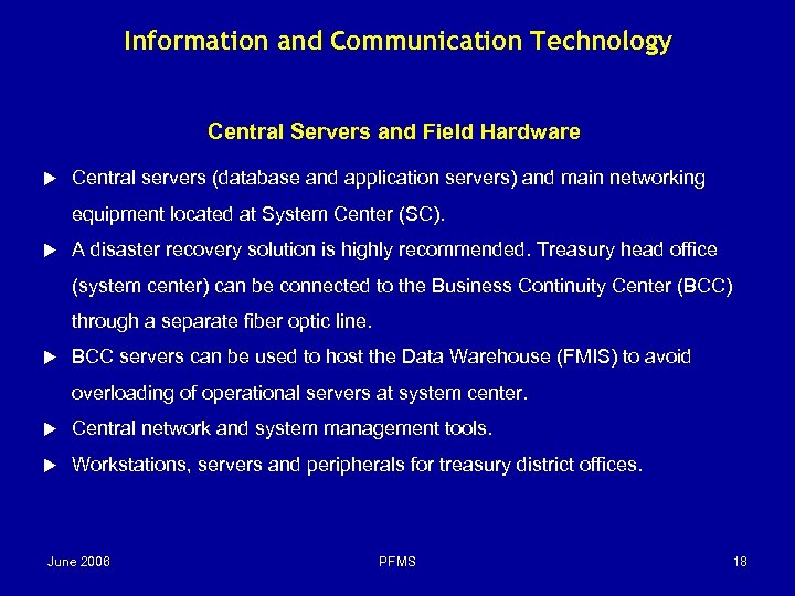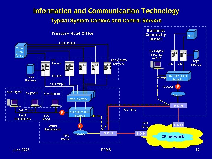 Information and Communication Technology Central Servers and Field Hardware u Central servers (database and application servers) and main networking equipment located at System Center (SC). u A disaster recovery solution is highly recommended. Treasury head office (system center) can be connected to the Business Continuity Center (BCC) through a separate fiber optic line. u BCC servers can be used to host the Data Warehouse (FMIS) to avoid overloading of operational servers at system center. u Central network and system management tools. u Workstations, servers and peripherals for treasury district offices. June 2006 PFMS 18