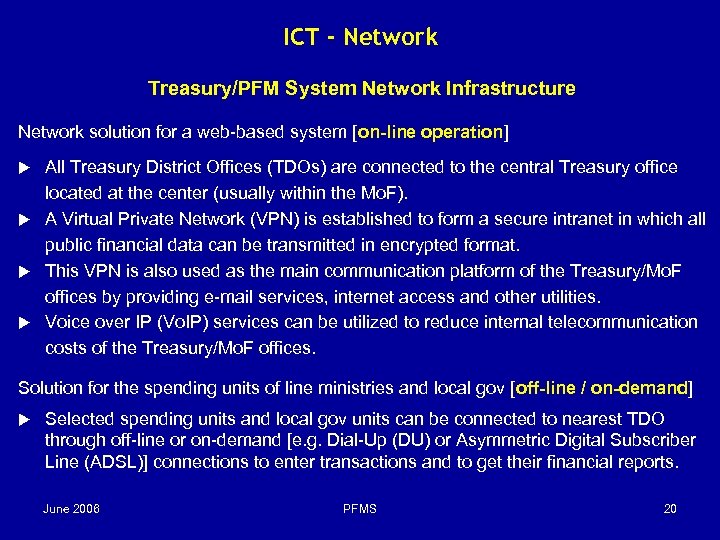 ICT - Network Treasury/PFM System Network Infrastructure Network solution for a web-based system [on-line operation] All Treasury District Offices (TDOs) are connected to the central Treasury office located at the center (usually within the Mo. F). u A Virtual Private Network (VPN) is established to form a secure intranet in which all public financial data can be transmitted in encrypted format. u This VPN is also used as the main communication platform of the Treasury/Mo. F offices by providing e-mail services, internet access and other utilities. u Voice over IP (Vo. IP) services can be utilized to reduce internal telecommunication costs of the Treasury/Mo. F offices. u Solution for the spending units of line ministries and local gov [off-line / on-demand] u Selected spending units and local gov units can be connected to nearest TDO through off-line or on-demand [e. g. Dial-Up (DU) or Asymmetric Digital Subscriber Line (ADSL)] connections to enter transactions and to get their financial reports. June 2006 PFMS 20