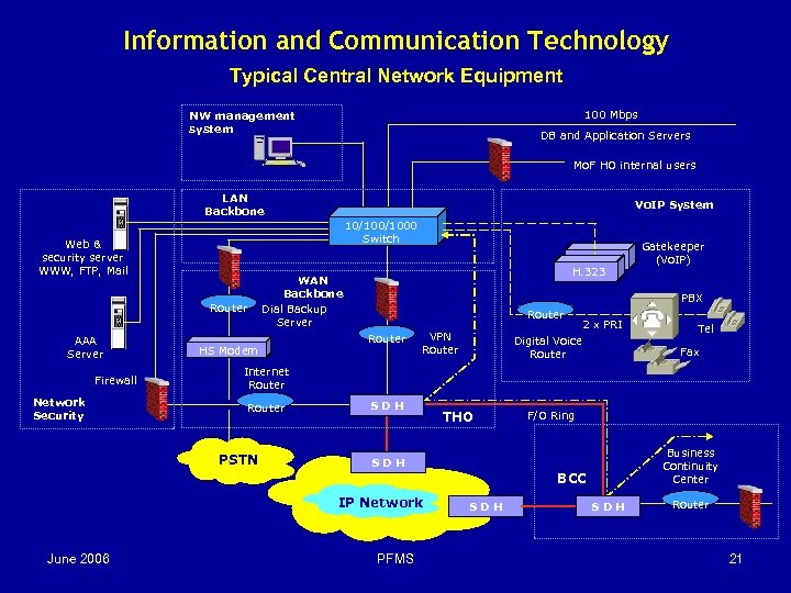Information and Communication Technology Typical Central Network Equipment 100 Mbps NW management system DB and Application Servers Mo. F HO internal users LAN Backbone 10/1000 Switch Web & security server WWW, FTP, Mail Firewall Network Security H. 323 WAN Backbone Dial Backup Server Router AAA Server Vo. IP System HS Modem PBX Router VPN Router 2 x PRI Digital Voice Router Tel Fax Internet Router PSTN SDH THO F/O Ring Business Continuity Center SDH BCC IP Network June 2006 Gatekeeper (Vo. IP) PFMS SDH Router 21