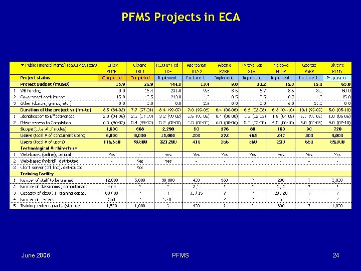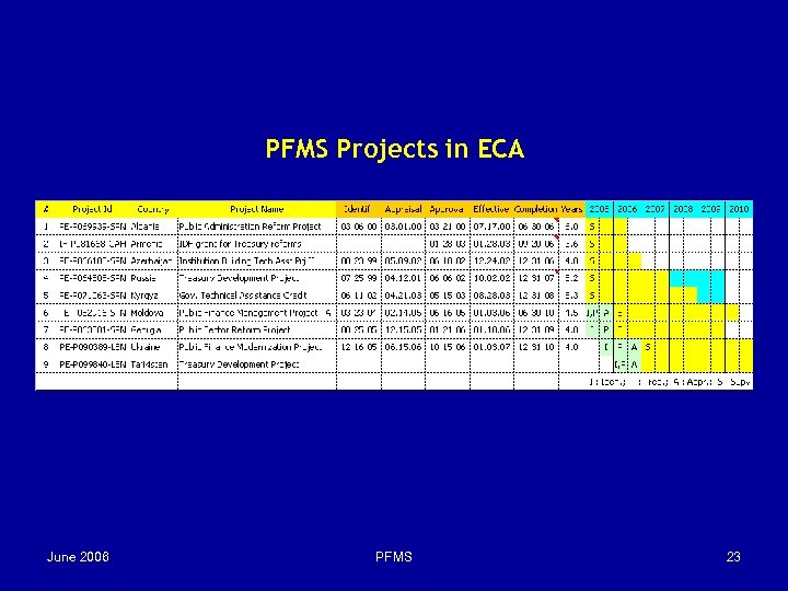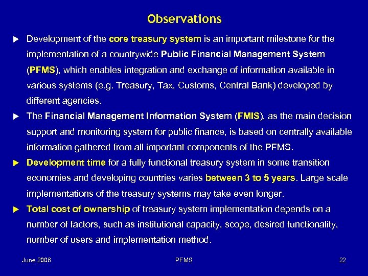 Observations u Development of the core treasury system is an important milestone for the implementation of a countrywide Public Financial Management System (PFMS), which enables integration and exchange of information available in various systems (e. g. Treasury, Tax, Customs, Central Bank) developed by different agencies. u The Financial Management Information System (FMIS), as the main decision support and monitoring system for public finance, is based on centrally available information gathered from all important components of the PFMS. u Development time for a fully functional treasury system in some transition economies and developing countries varies between 3 to 5 years. Large scale implementations of the treasury systems may take even longer. u Total cost of ownership of treasury system implementation depends on a number of factors, such as institutional capacity, scope, desired functionality, number of users and implementation method. June 2006 PFMS 22