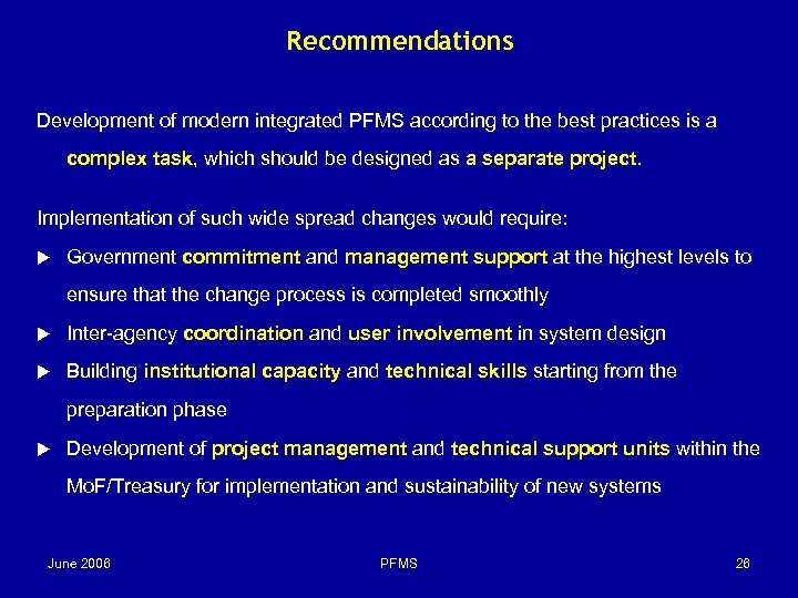 Recommendations Development of modern integrated PFMS according to the best practices is a complex task, which should be designed as a separate project. Implementation of such wide spread changes would require: u Government commitment and management support at the highest levels to ensure that the change process is completed smoothly u Inter-agency coordination and user involvement in system design u Building institutional capacity and technical skills starting from the preparation phase u Development of project management and technical support units within the Mo. F/Treasury for implementation and sustainability of new systems June 2006 PFMS 26
