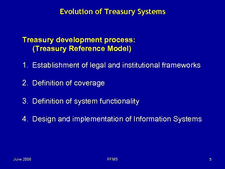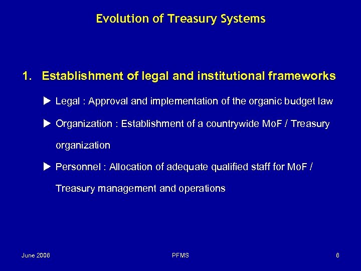 Evolution of Treasury Systems Treasury development process: (Treasury Reference Model) 1. Establishment of legal and institutional frameworks 2. Definition of coverage 3. Definition of system functionality 4. Design and implementation of Information Systems June 2006 PFMS 5