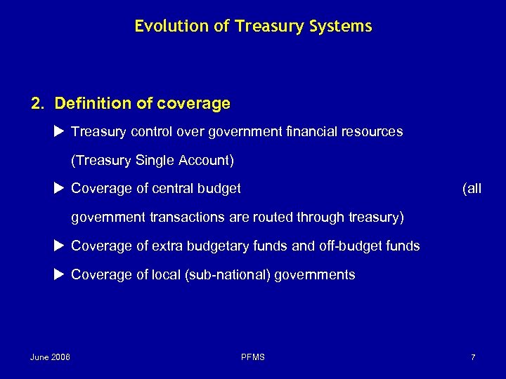 Evolution of Treasury Systems 1. Establishment of legal and institutional frameworks u Legal : Approval and implementation of the organic budget law u Organization : Establishment of a countrywide Mo. F / Treasury organization u Personnel : Allocation of adequate qualified staff for Mo. F / Treasury management and operations June 2006 PFMS 6
