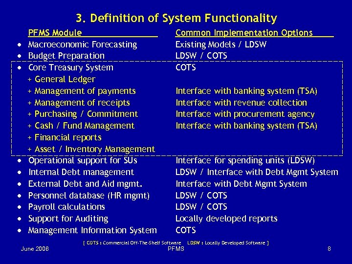 3. Definition of System Functionality · · · · · PFMS Module Macroeconomic Forecasting Budget Preparation Core Treasury System + General Ledger + Management of payments + Management of receipts + Purchasing / Commitment + Cash / Fund Management + Financial reports + Asset / Inventory Management Operational support for SUs Internal Debt management External Debt and Aid mgmt. Personnel database (HR mgmt) Payroll calculations Support for Auditing Management Information System Common Implementation Options Existing Models / LDSW / COTS Interface banking system (TSA) revenue collection procurement agency banking system (TSA) Interface for spending units (LDSW) LDSW / Interface with Debt Mgmt System LDSW / COTS Locally developed reports COTS [ COTS : Commercial Off-The-Shelf Software June 2006 with PFMS LDSW : Locally Developed Software ] 8