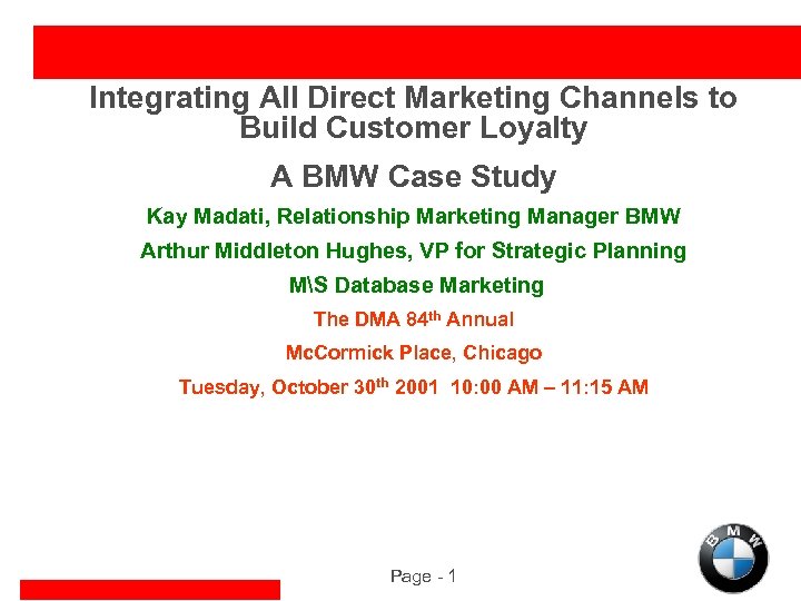 Integrating All Direct Marketing Channels to Build Customer Loyalty A BMW Case Study Kay Madati, Relationship Marketing Manager BMW Arthur Middleton Hughes, VP for Strategic Planning MS Database Marketing The DMA 84 th Annual Mc. Cormick Place, Chicago Tuesday, October 30 th 2001 10: 00 AM – 11: 15 AM Page - 1