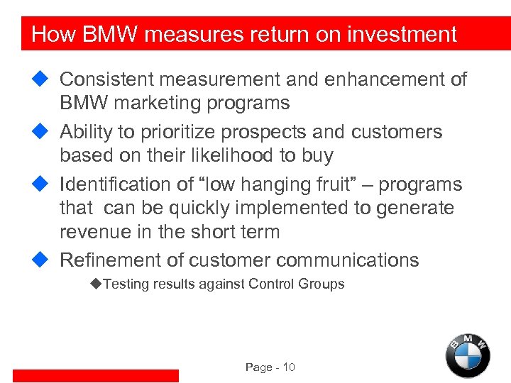 How BMW measures return on investment u Consistent measurement and enhancement of BMW marketing programs u Ability to prioritize prospects and customers based on their likelihood to buy u Identification of “low hanging fruit” – programs that can be quickly implemented to generate revenue in the short term u Refinement of customer communications u. Testing results against Control Groups Page - 10
