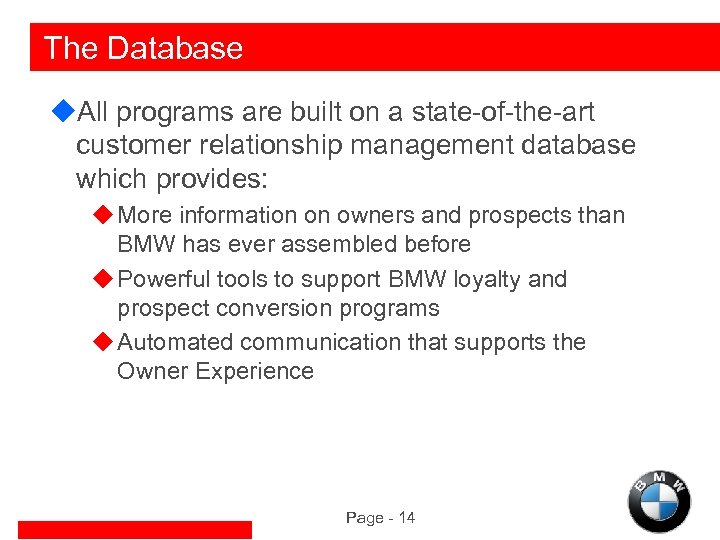 The Database u. All programs are built on a state-of-the-art customer relationship management database which provides: u More information on owners and prospects than BMW has ever assembled before u Powerful tools to support BMW loyalty and prospect conversion programs u Automated communication that supports the Owner Experience Page - 14