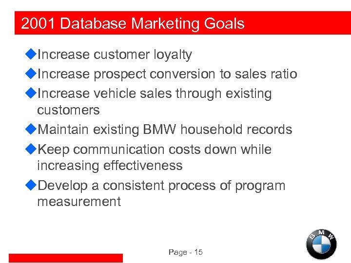 2001 Database Marketing Goals u. Increase customer loyalty u. Increase prospect conversion to sales ratio u. Increase vehicle sales through existing customers u. Maintain existing BMW household records u. Keep communication costs down while increasing effectiveness u. Develop a consistent process of program measurement Page - 15