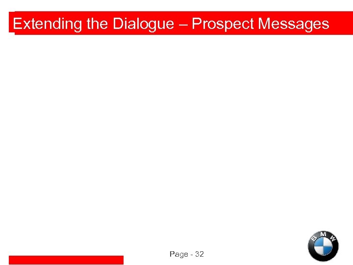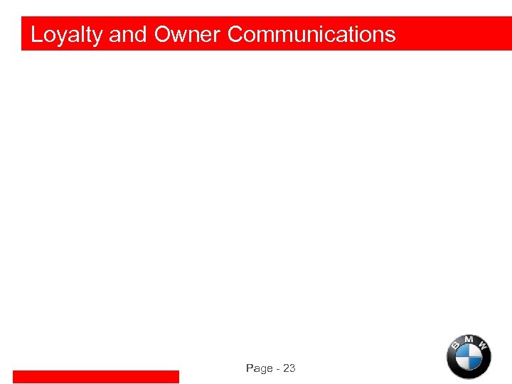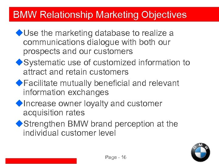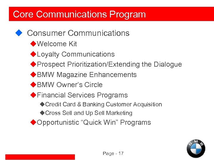 BMW Relationship Marketing Objectives u. Use the marketing database to realize a communications dialogue with both our prospects and our customers u. Systematic use of customized information to attract and retain customers u. Facilitate mutually beneficial and relevant information exchanges u. Increase owner loyalty and customer acquisition rates u. Strengthen BMW brand perception at the individual customer level Page - 16