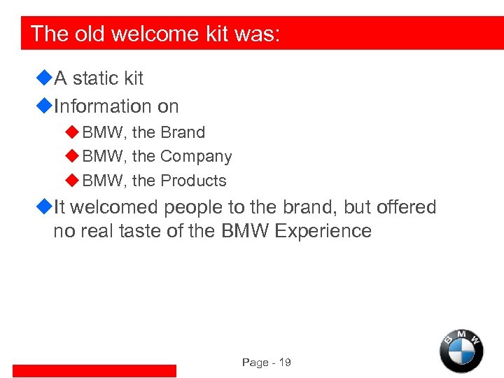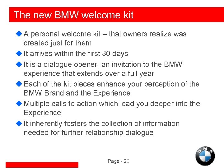 The old welcome kit was: u. A static kit u. Information on u BMW, the Brand u BMW, the Company u BMW, the Products u. It welcomed people to the brand, but offered no real taste of the BMW Experience Page - 19