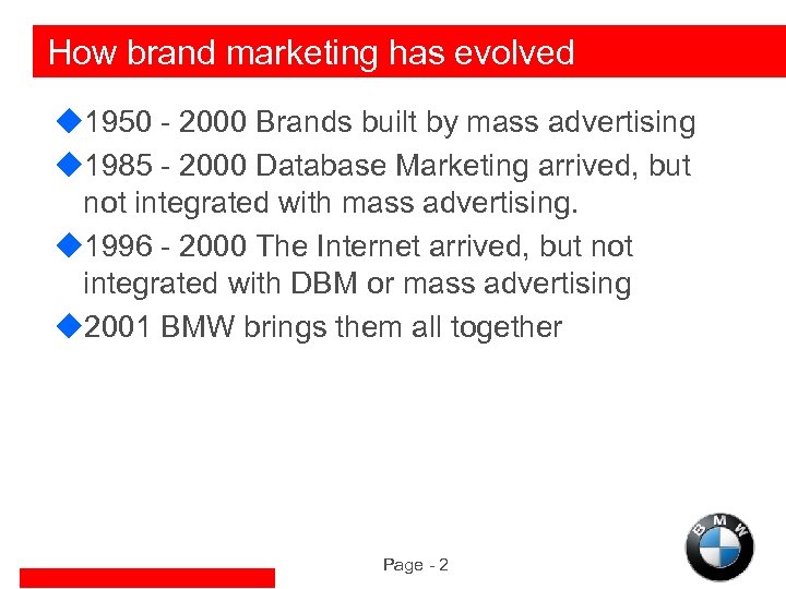 How brand marketing has evolved u 1950 - 2000 Brands built by mass advertising u 1985 - 2000 Database Marketing arrived, but not integrated with mass advertising. u 1996 - 2000 The Internet arrived, but not integrated with DBM or mass advertising u 2001 BMW brings them all together Page - 2