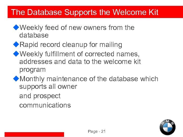 The Database Supports the Welcome Kit u. Weekly feed of new owners from the database u. Rapid record cleanup for mailing u. Weekly fulfillment of corrected names, addresses and data to the welcome kit program u. Monthly maintenance of the database which supports all owner and prospect communications Page - 21