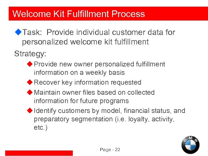 Welcome Kit Fulfillment Process u. Task: Provide individual customer data for personalized welcome kit fulfillment Strategy: u Provide new owner personalized fulfillment information on a weekly basis u Recover key information requested u Maintain owner files based on collected information for future programs u Identify customers by model, financial status, and preparatory segmentation (i. e. loyalty, activity, etc. ) Page - 22