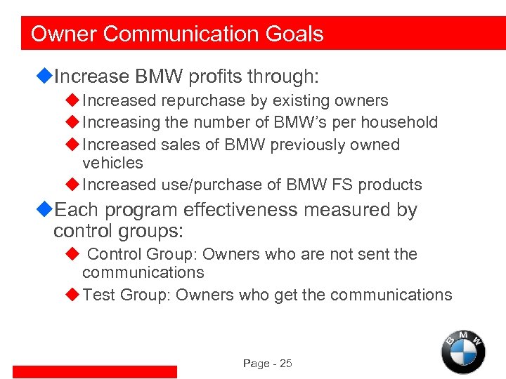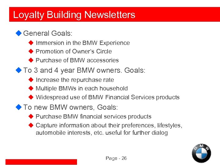 Owner Communication Goals u. Increase BMW profits through: u Increased repurchase by existing owners u Increasing the number of BMW’s per household u Increased sales of BMW previously owned vehicles u Increased use/purchase of BMW FS products u. Each program effectiveness measured by control groups: u Control Group: Owners who are not sent the communications u Test Group: Owners who get the communications Page - 25