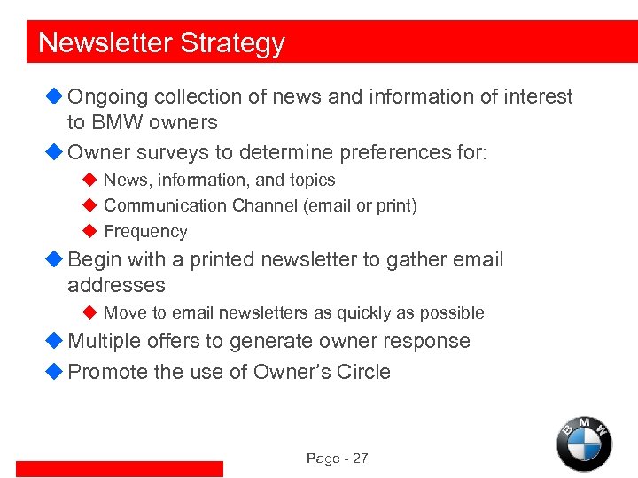 Newsletter Strategy u Ongoing collection of news and information of interest to BMW owners u Owner surveys to determine preferences for: u News, information, and topics u Communication Channel (email or print) u Frequency u Begin with a printed newsletter to gather email addresses u Move to email newsletters as quickly as possible u Multiple offers to generate owner response u Promote the use of Owner’s Circle Page - 27