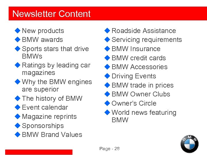 Newsletter Content u New products u BMW awards u Sports stars that drive BMWs u Ratings by leading car magazines u Why the BMW engines are superior u The history of BMW u Event calendar u Magazine reprints u Sponsorships u BMW Brand Values u Roadside Assistance u Servicing requirements u BMW Insurance u BMW credit cards u BMW Accessories u Driving Events u BMW trade in prices u BMW Owner Clubs u Owner’s Circle u World news featuring BMW Page - 28