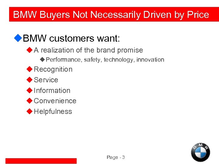 BMW Buyers Not Necessarily Driven by Price u. BMW customers want: u A realization of the brand promise u Performance, safety, technology, innovation u Recognition u Service u Information u Convenience u Helpfulness Page - 3