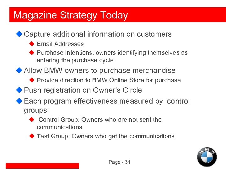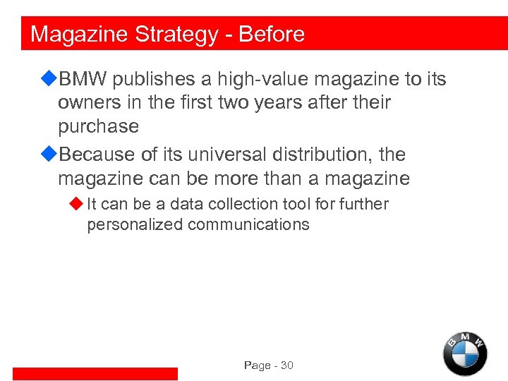 Magazine Strategy - Before u. BMW publishes a high-value magazine to its owners in the first two years after their purchase u. Because of its universal distribution, the magazine can be more than a magazine u It can be a data collection tool for further personalized communications Page - 30