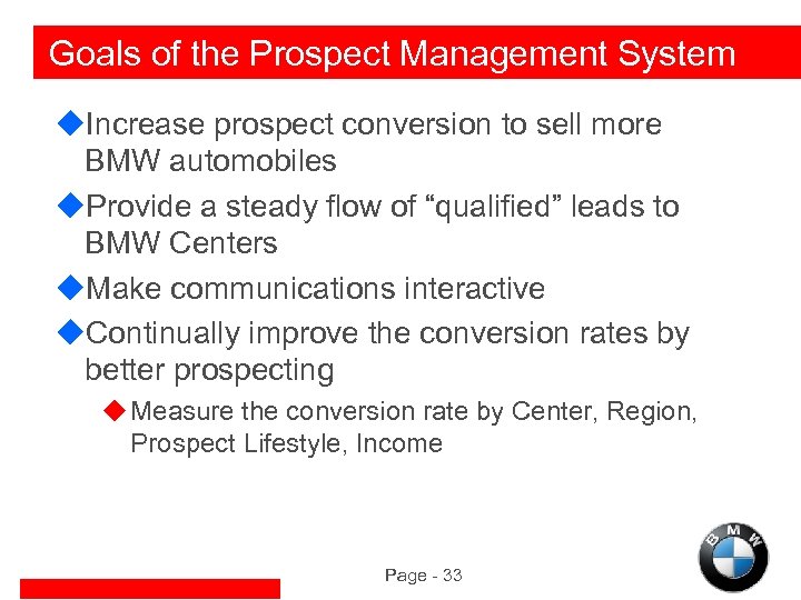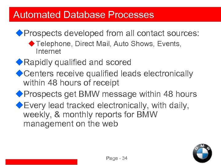 Goals of the Prospect Management System u. Increase prospect conversion to sell more BMW automobiles u. Provide a steady flow of “qualified” leads to BMW Centers u. Make communications interactive u. Continually improve the conversion rates by better prospecting u Measure the conversion rate by Center, Region, Prospect Lifestyle, Income Page - 33