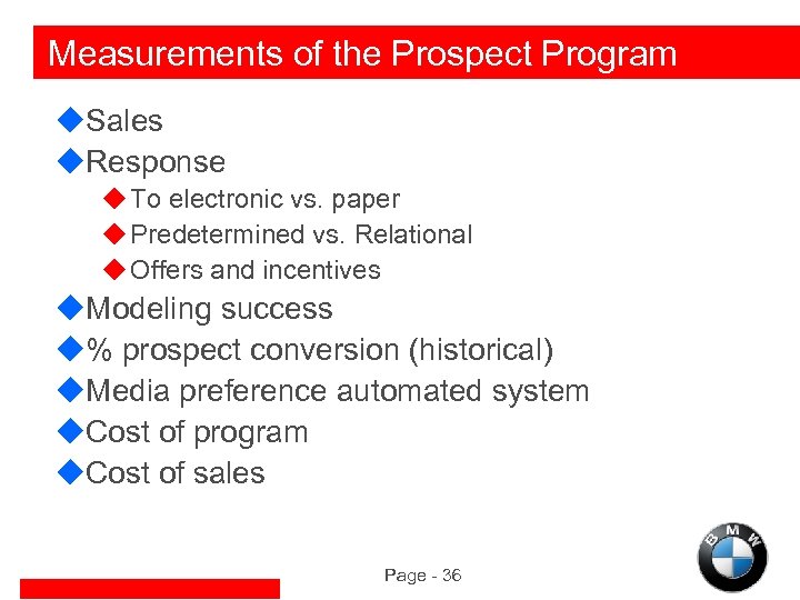Measurements of the Prospect Program u. Sales u. Response u To electronic vs. paper u Predetermined vs. Relational u Offers and incentives u. Modeling success u% prospect conversion (historical) u. Media preference automated system u. Cost of program u. Cost of sales Page - 36
