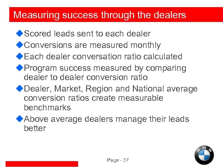 Measuring success through the dealers u. Scored leads sent to each dealer u. Conversions are measured monthly u. Each dealer conversation ratio calculated u. Program success measured by comparing dealer to dealer conversion ratio u. Dealer, Market, Region and National average conversion ratios create measurable benchmarks u. Above average dealers manage their leads better Page - 37